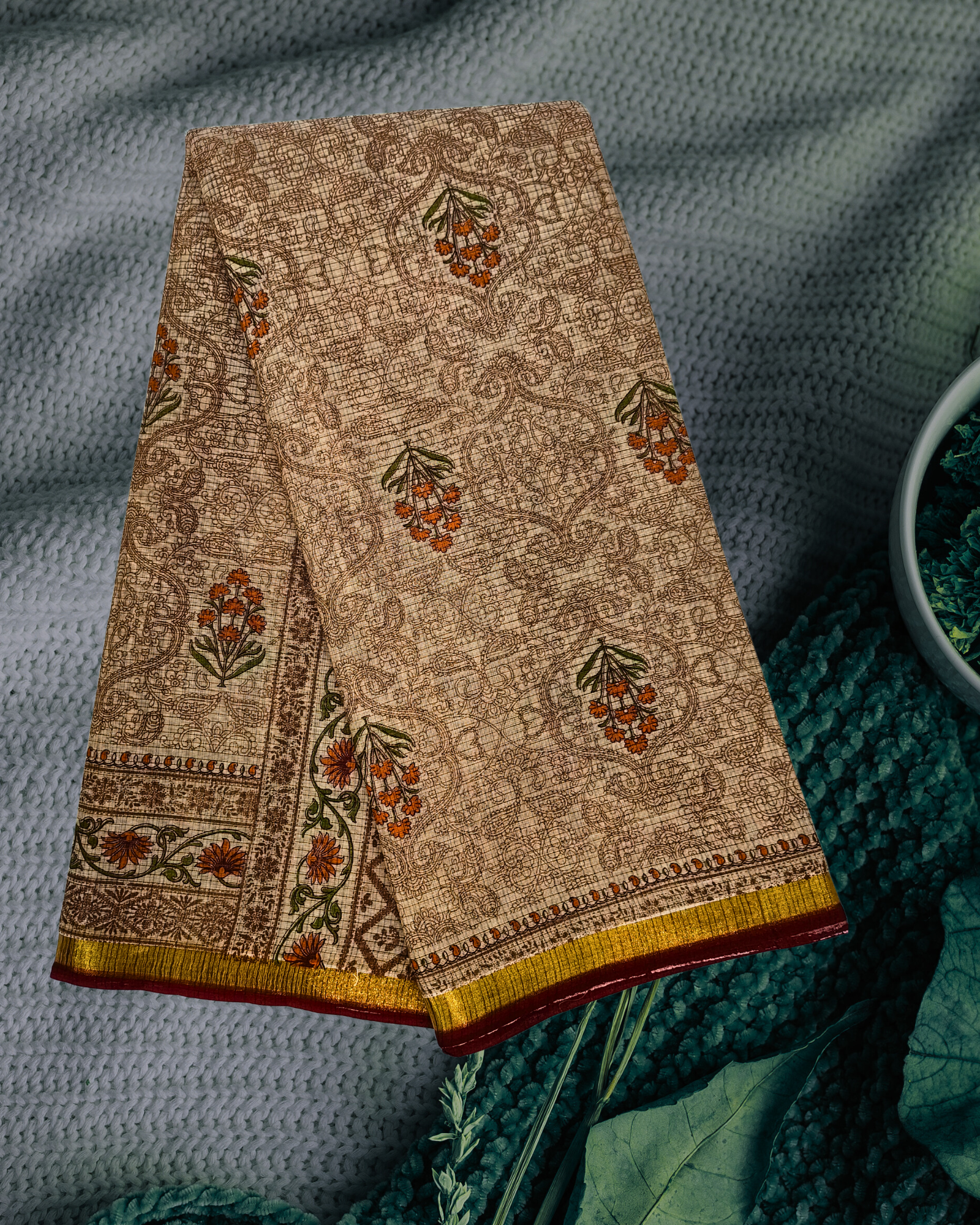 The saree displays a refined blend of beige and brown textures paired with small floral buttas throughout. The traditional floral-patterned border with golden and pink highlights elevates the design. It is perfect for elegant everyday use, cultural programs, and light festive wear.