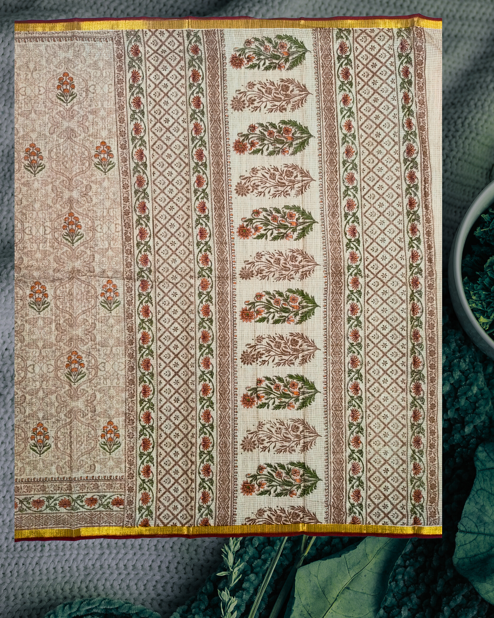 This exquisite cotton saree features kalasukruti-style motifs in a warm brown palette. Subtle floral sprigs and intricately patterned textures give it a handwoven appeal. The golden border highlights its sophisticated charm. Ideal for traditional functions, temple visits, and dignified office wear.