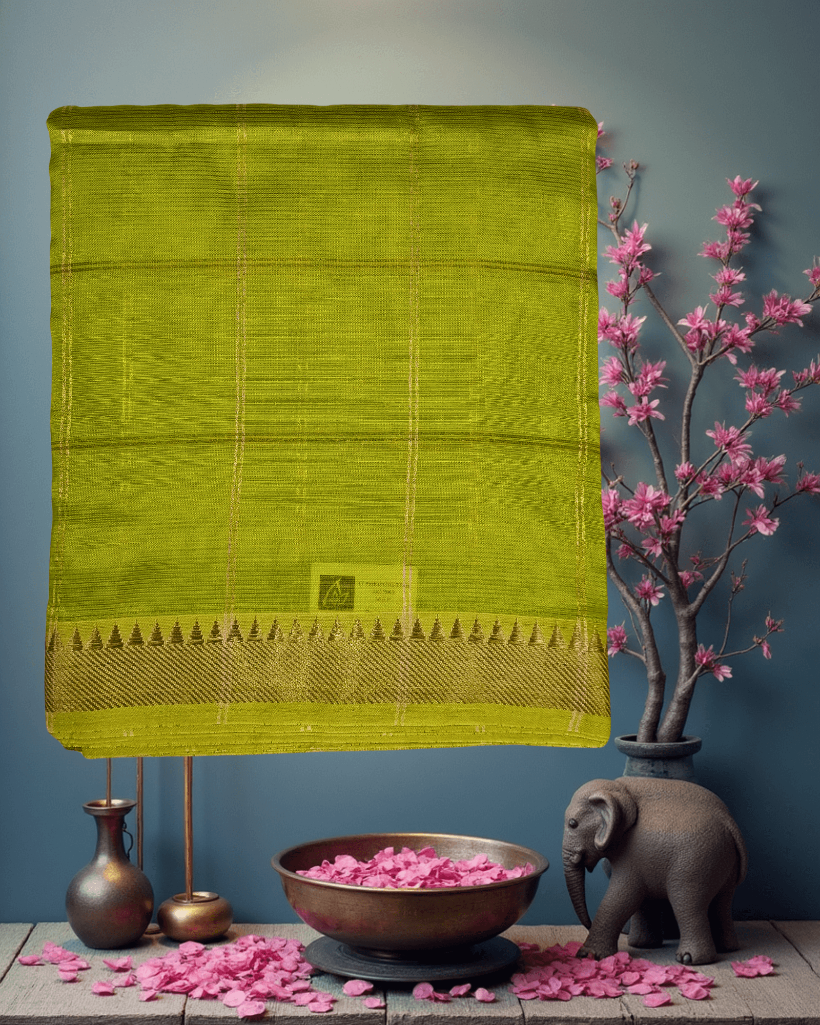 The Glow of Gold on Vibrant Green This saree is a celebration of classic Indian festive colors: a dazzling green paired with rich gold. The Patur Handloom Art Silk fabric is woven in a vibrant, almost neon Parrot Green, giving the saree an incredible glow and a fluid, flattering drape. Subtle check patterns are woven into the body, adding a layer of sophisticated texture that catches the light beautifully.