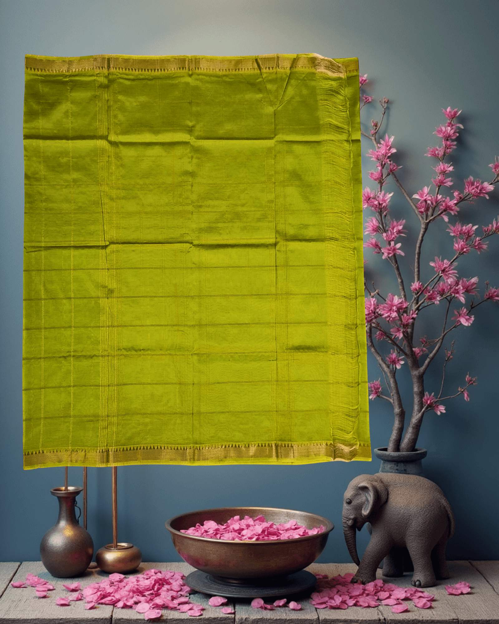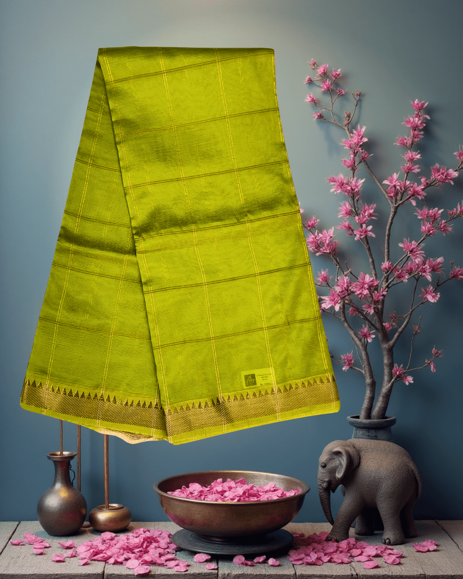 A show-stopping Art Silk handloom saree in a luminous Parrot Green, featuring subtle check textures and a rich, traditional Temple Border intricately woven with brilliant Golden Jari.