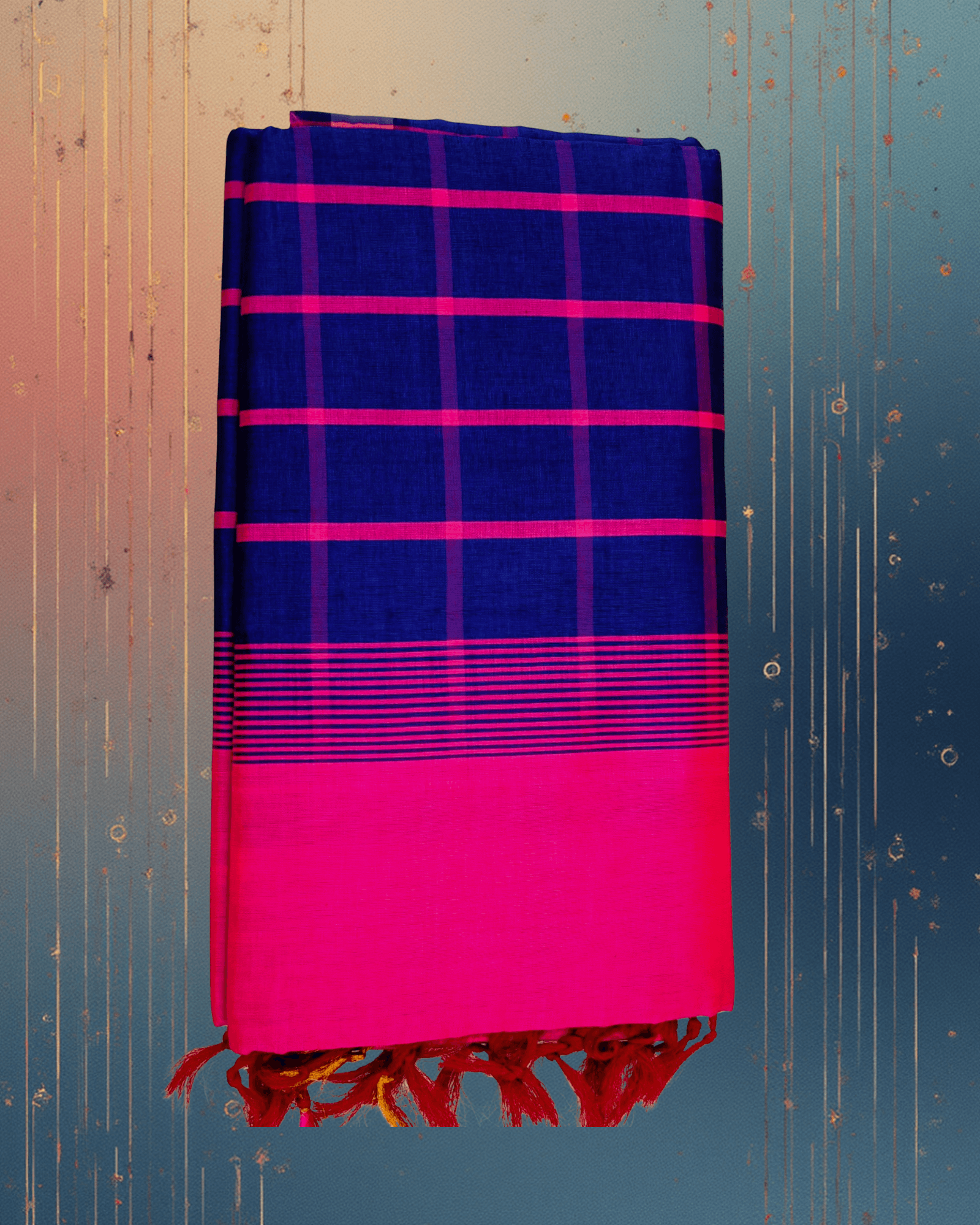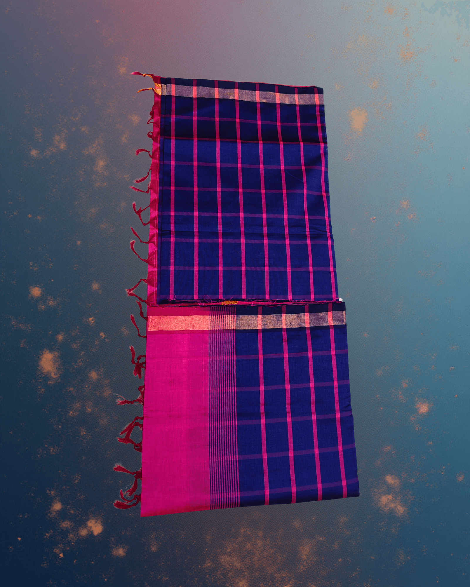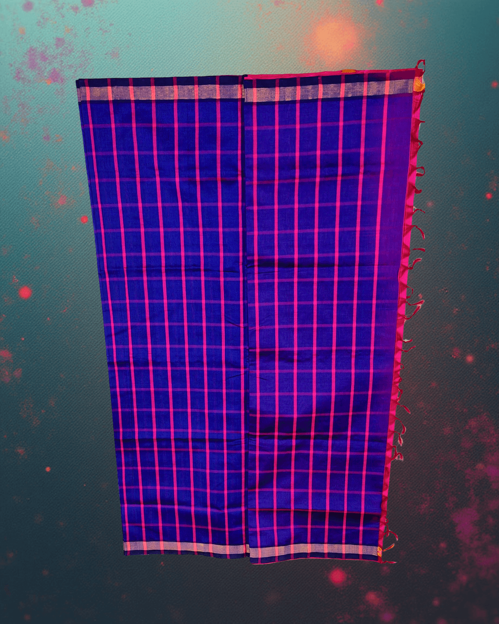 - Body Design: The main body features a prominent Kattam (Check) pattern formed by the intersection of fine Hot Pink horizontal and vertical lines woven over the Navy Blue base.
