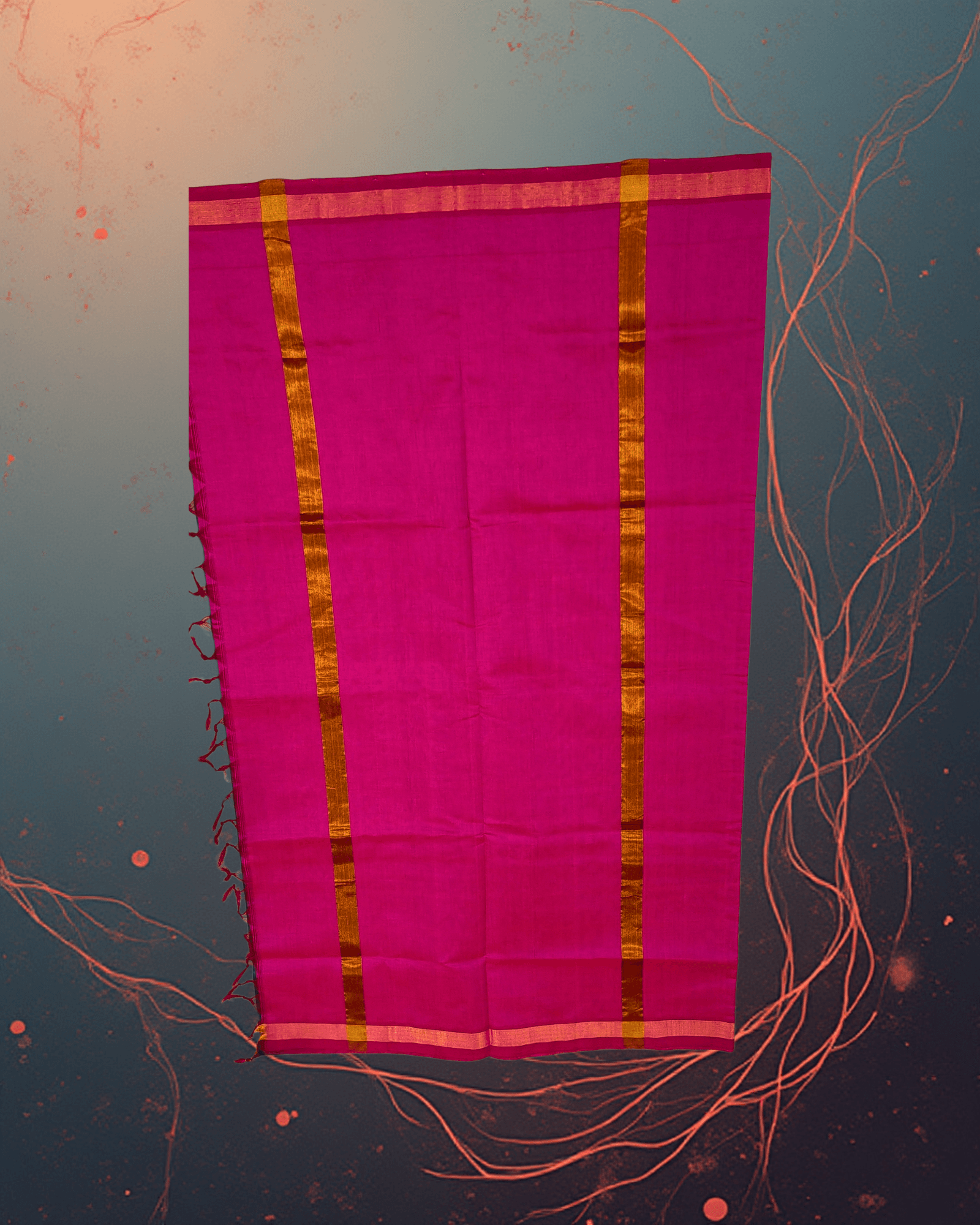 - Pallu & Border: The lower border and the pallu are entirely solid Hot Pink, creating a dramatic block-color contrast. The pallu end is finished with traditional woven bands and bold, matching tassels.