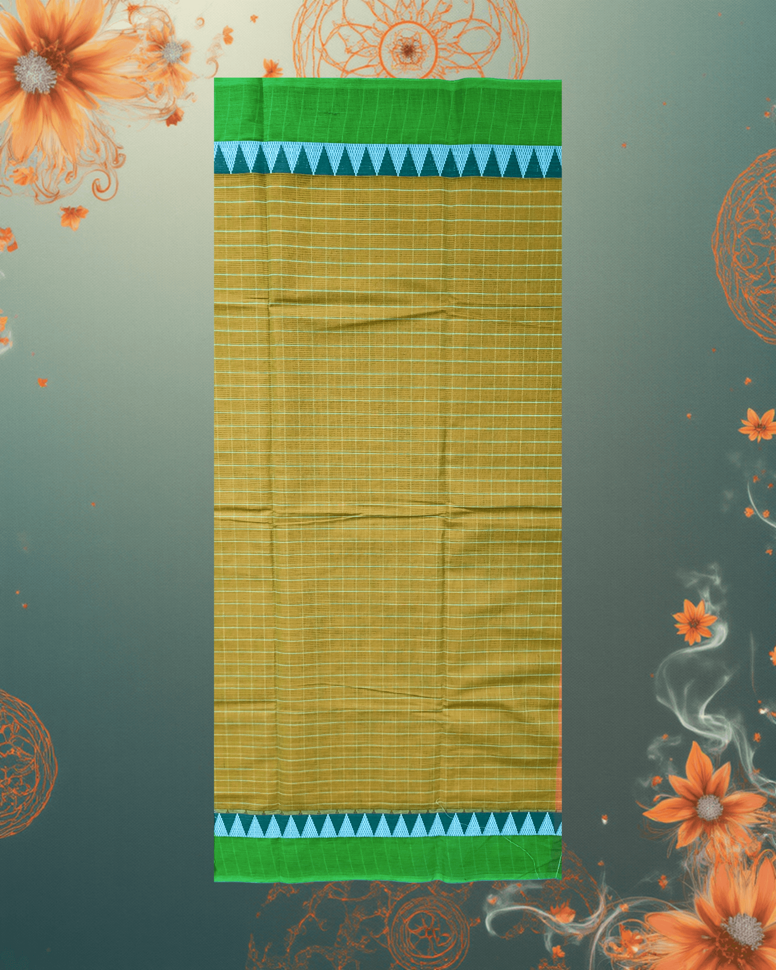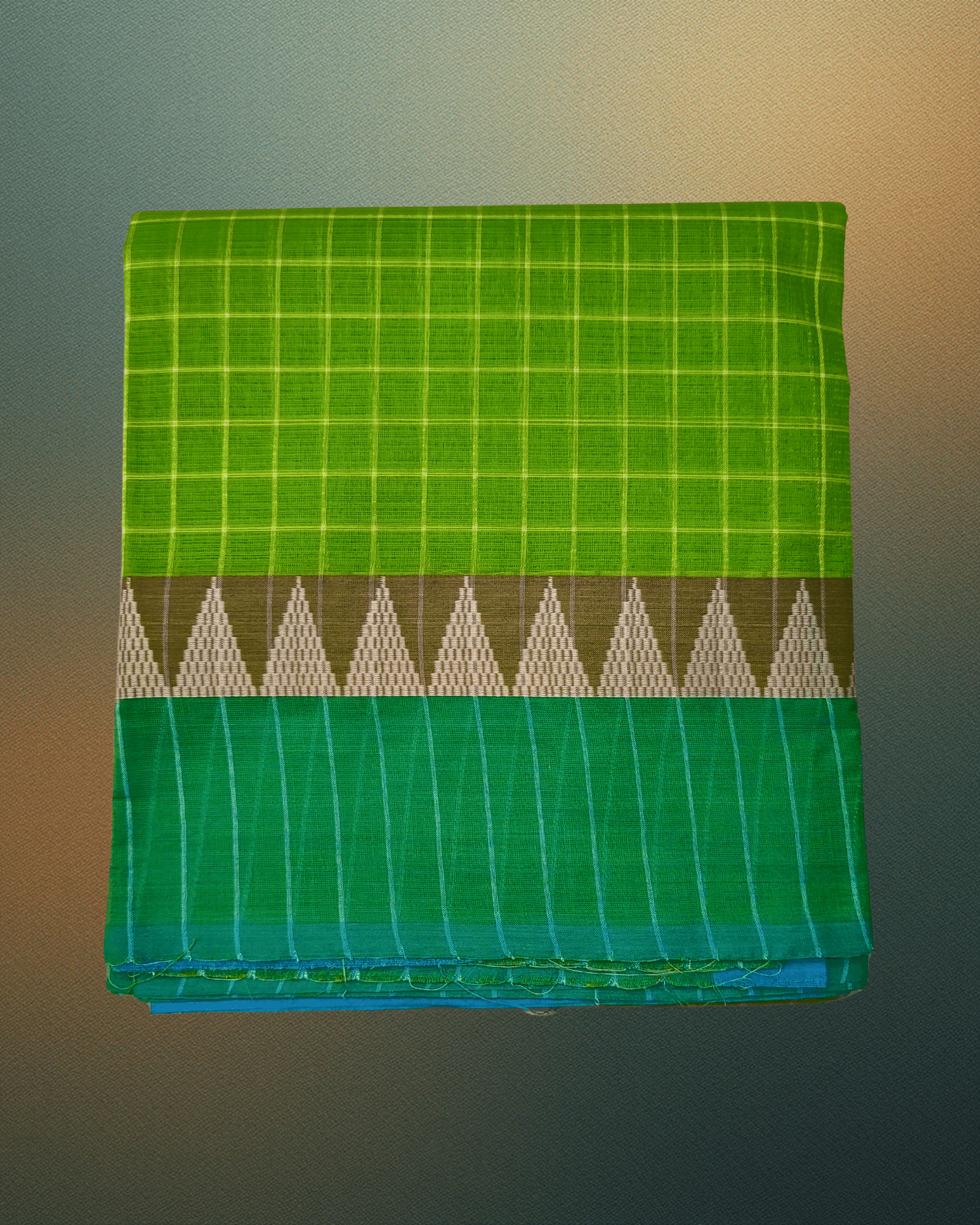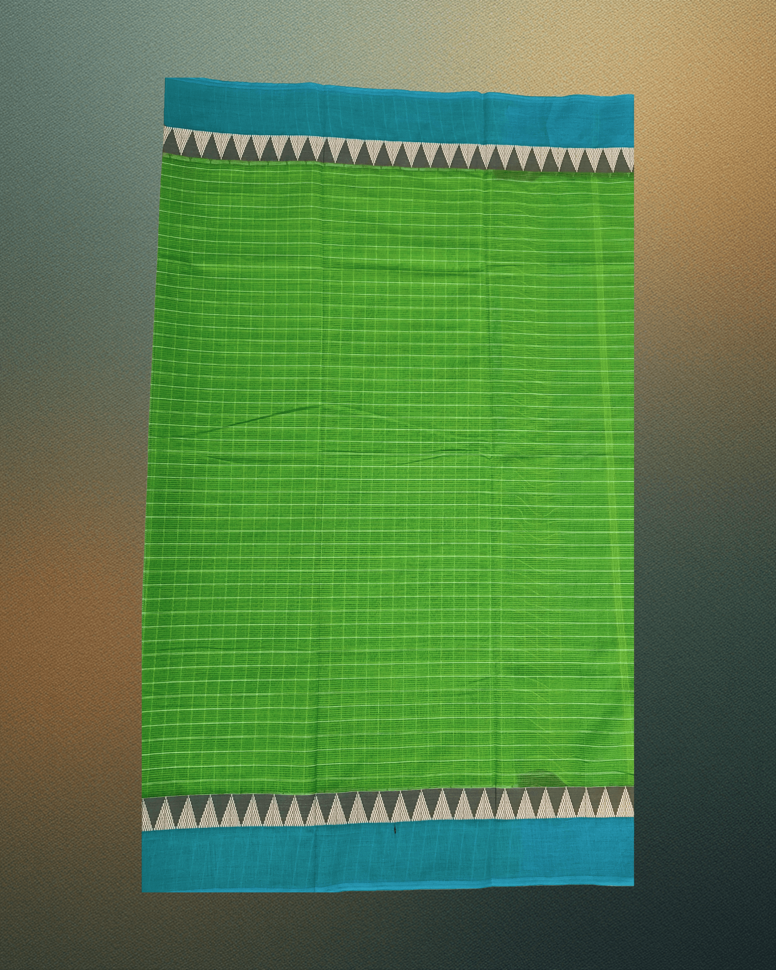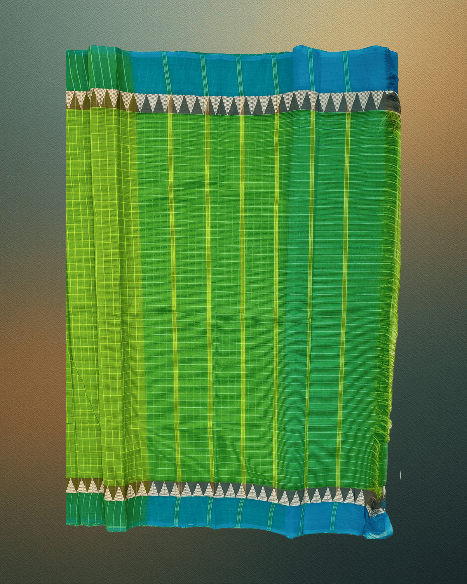 A crisp and vibrant handloom cotton saree in Parrot Green checks, perfectly complemented by a contrasting Teal border and traditional dual-tone Temple motifs, offering comfort with a classic drape.