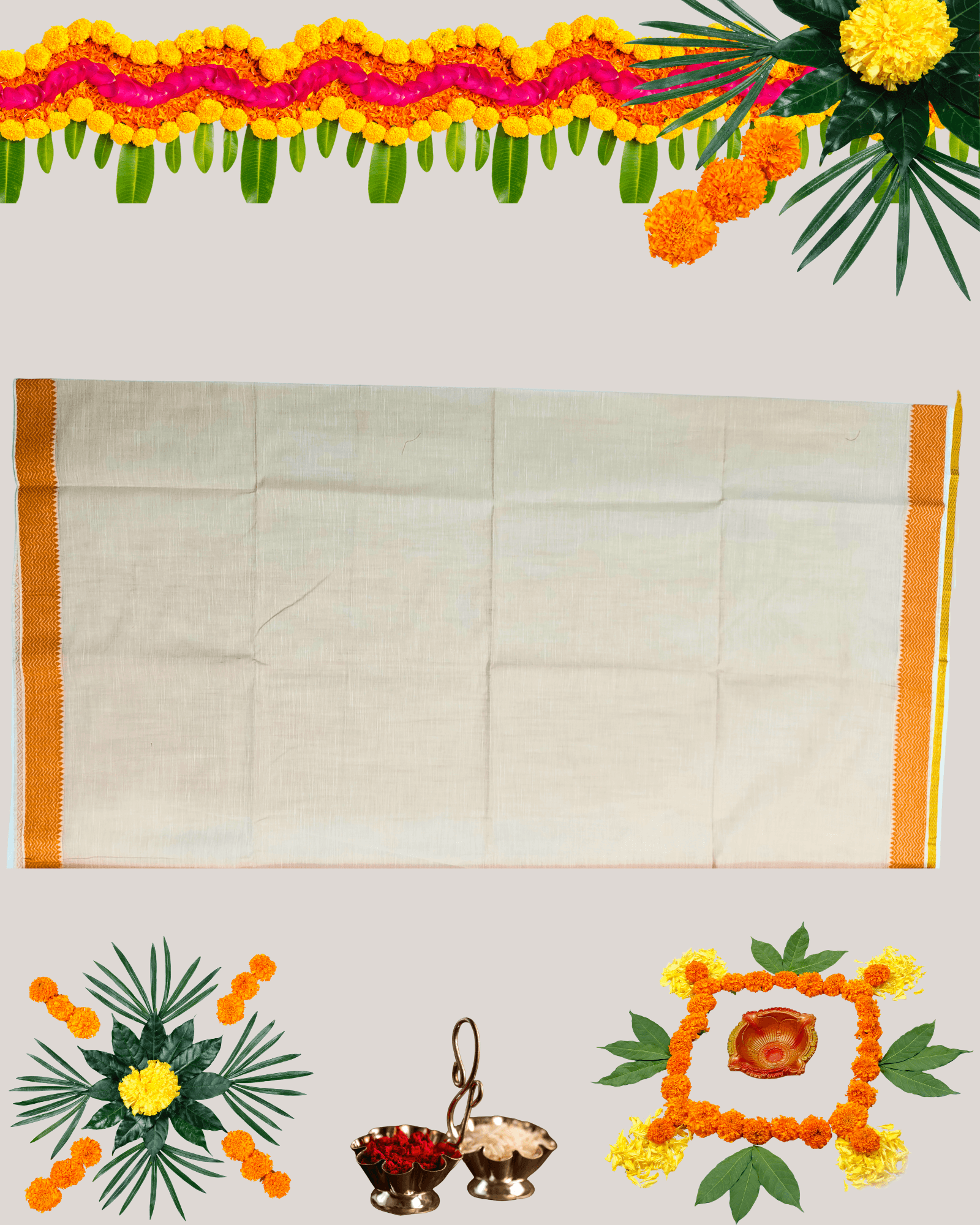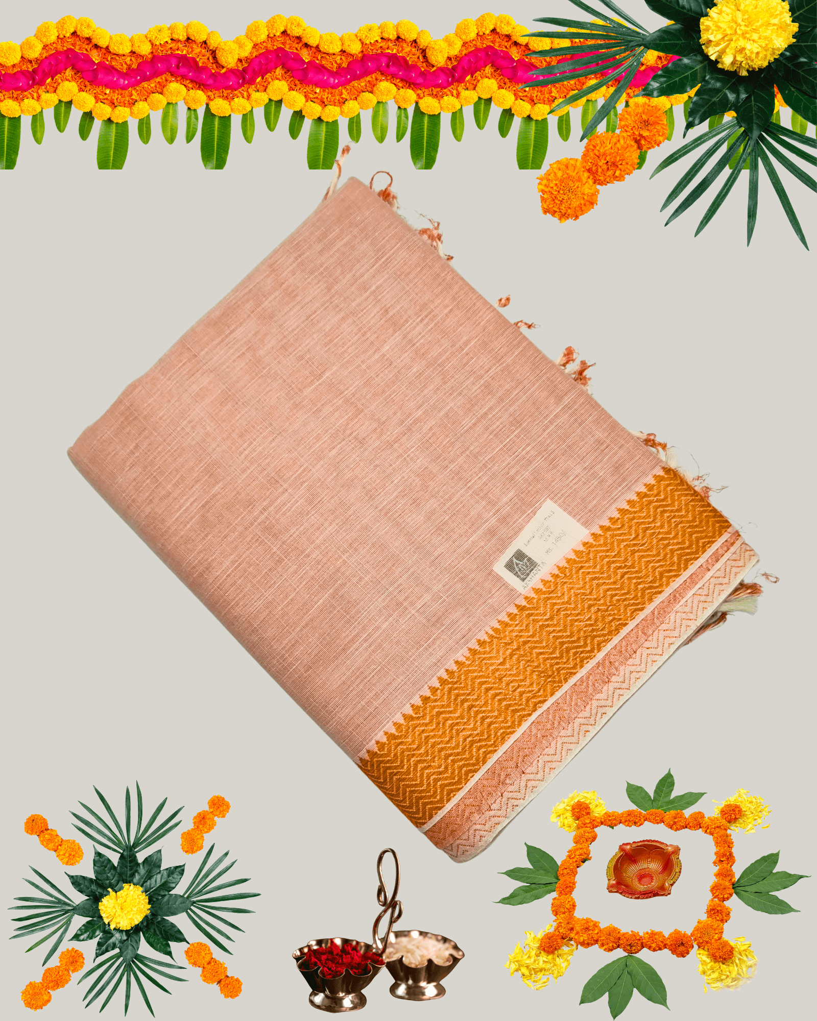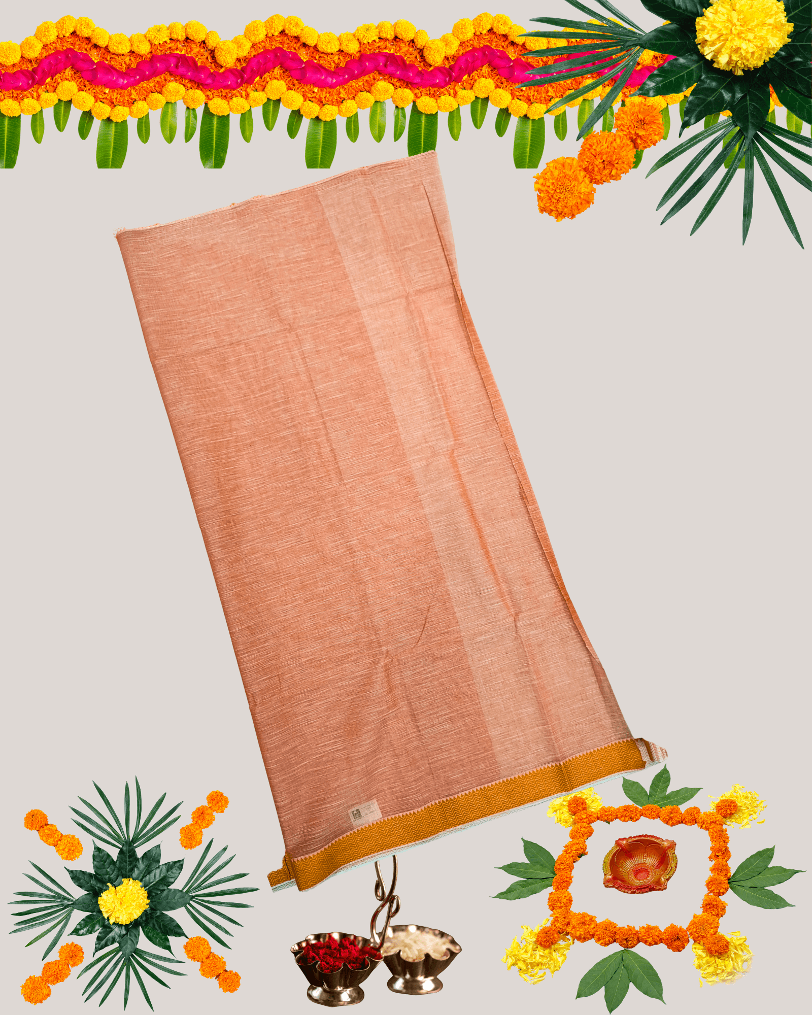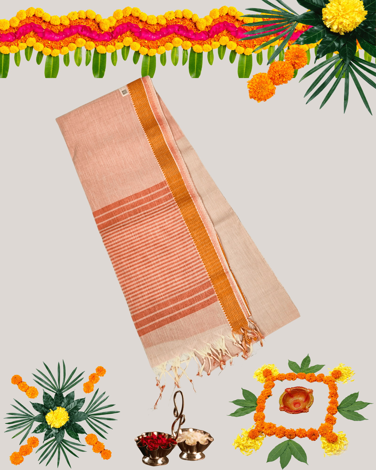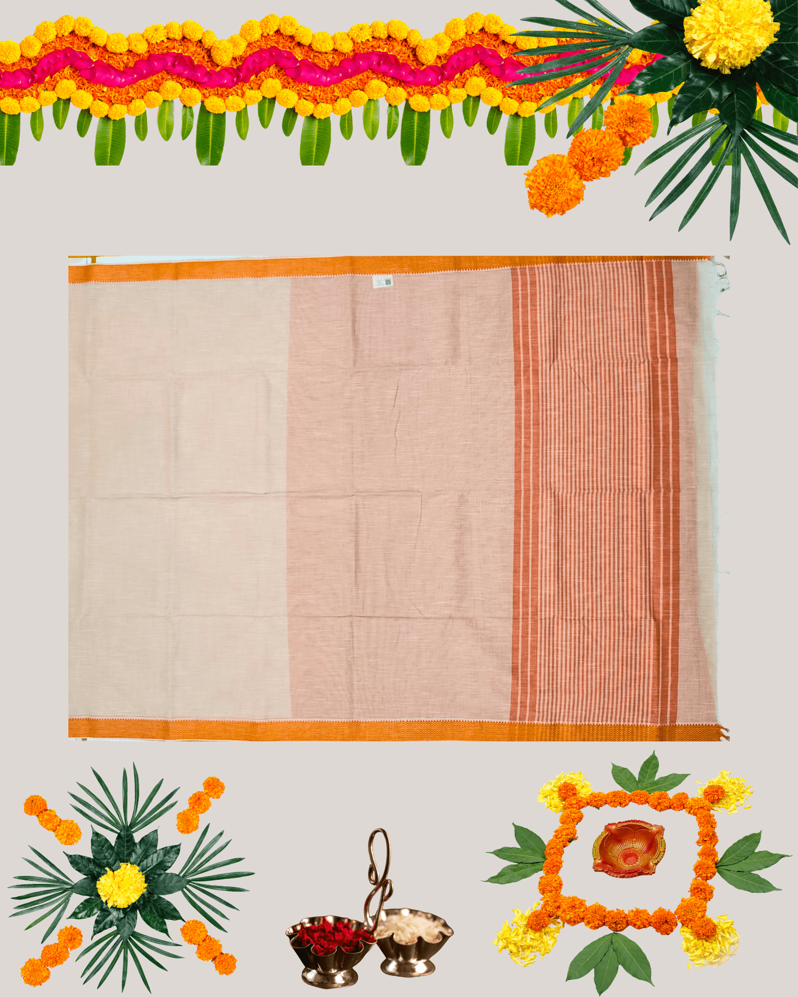 Off-White/Light Maroon mixed weave (gives a peachy/fawn tone). Gold Zari/Mustard border.