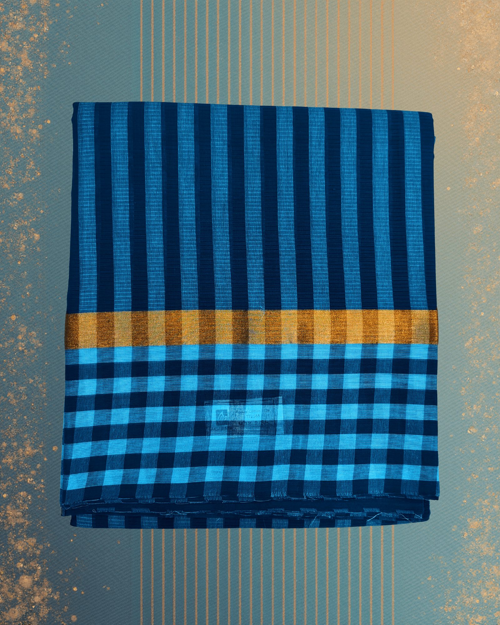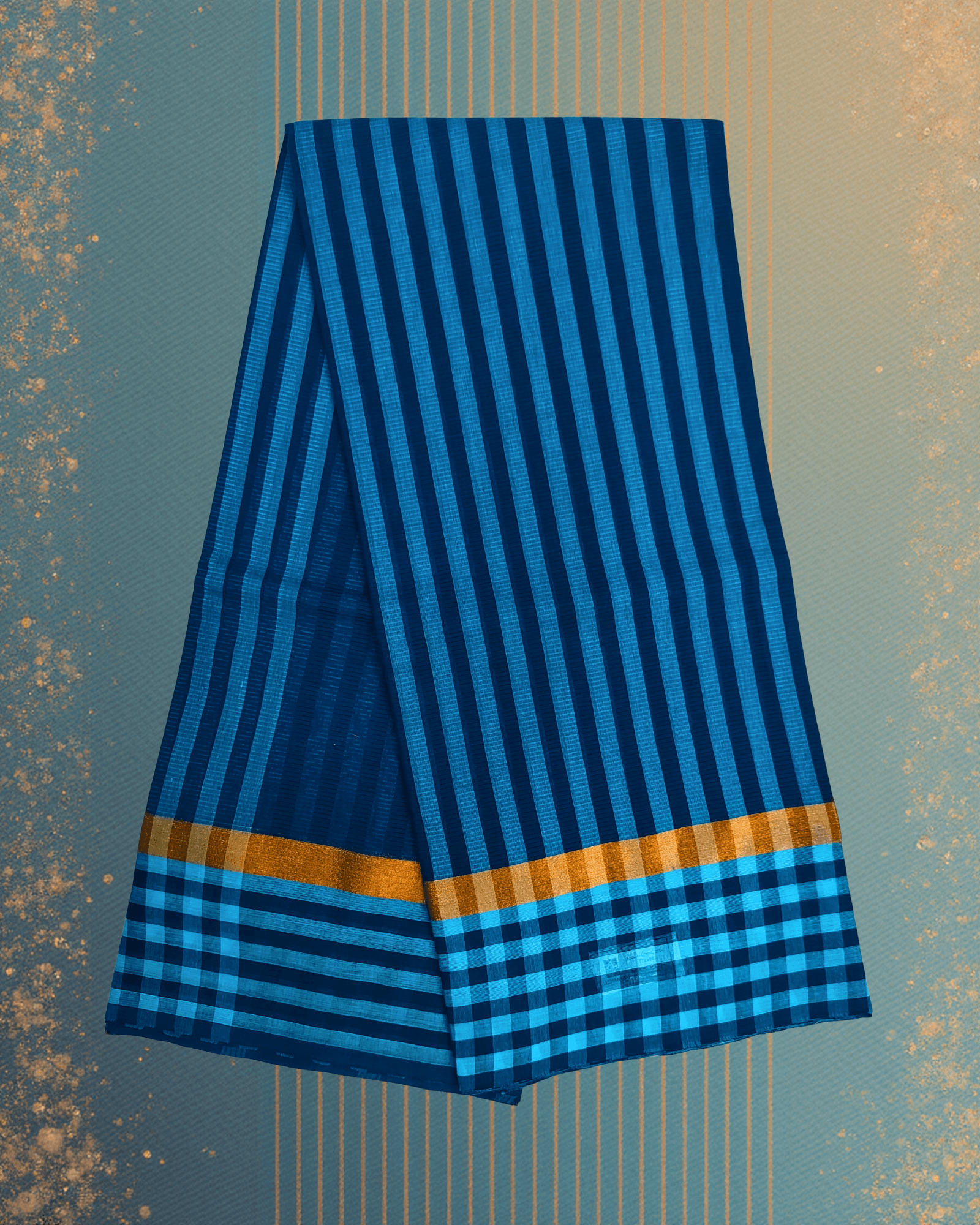 The border serves as a bright, artistic contrast to the cool blue body. The edge transitions from the vertical blue stripes into distinct, wide horizontal stripe lines woven in warm accent colors like yellow, pink, and pale green. This cross-patterning is a beautiful example of handloom artistry and provides a vibrant, celebratory frame. The border is finished with a delicate line of Golden Jari, which harmonizes the traditional metallic element with the contemporary color and pattern mixing. An ideal choice for daytime parties, sophisticated semi-formal events, or everyday elegance.